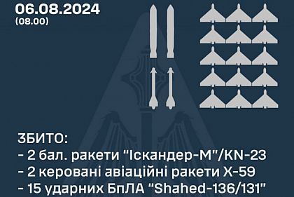 В ночь на 6 августа над Украиной уничтожили 4 ракеты и 15 беспилотников