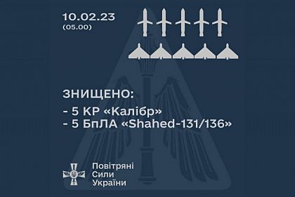 В пятницу, 10 февраля, Силы и средства Воздушных Сил ВС Украины уничтожили 5 из 6 крылатых ракет «Калибр» и 5 из 7 ударных дронов «Shahed-136/131», которые противник выпустил по городам и объектам...