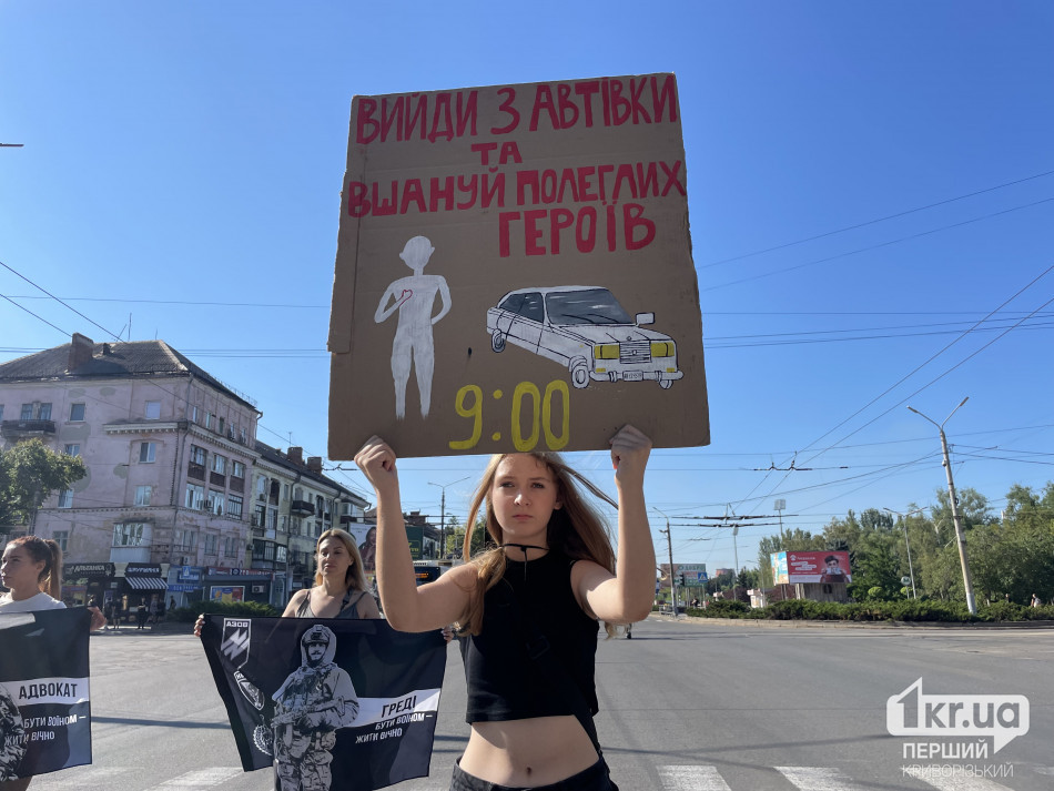 Люди держали в руках портреты павших защитников Украины, национальные флаги и плакаты с надписями: «Вечная память Герою Украины», «Внимание! Минута молчания», «Почтим память Героев», «Приложи руку к сердцу», «Выйди из авто».