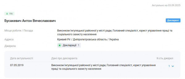 В декларации кандидата за 2019 год он значится как главный специалист-юрист управления труда и социальной защиты населения исполкома Ингулецкого райсовета. 14 марта 2025 года Антон Бусакевич зарегистрировал ФЛП.