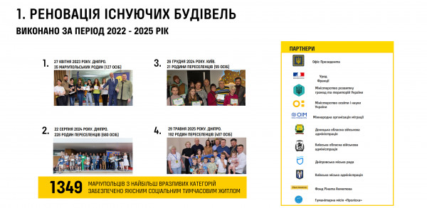 В целом, по данным Мариупольской городской администрации, на сегодня в этом городе 1294 мариупольца из самых уязвимых категорий обеспечены качественным социальным временным жильем.