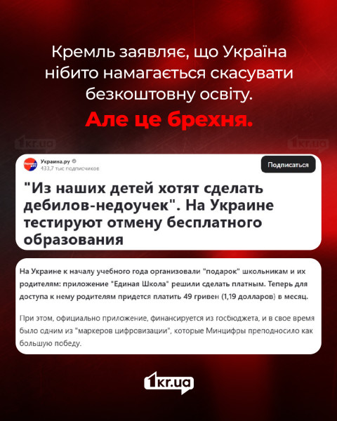 Кремлевские ресурсы публикуют материалы с громкими заголовками вроде: «В Украине тестируют отмену бесплатного образования». В текстах утверждается, что родителям теперь придется платить за доступ к оценкам, домашним заданиям и даже за возможность общаться с учителями. Это подается как «начало коммерциализации украинской школы».