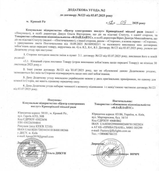 Также мы нашли на сайте Prozorro дополнительное соглашение от 12 сентября, заключенное с подрядчиком, ООО «Флайлайтс» об изменении конечного срока поставки товара — не позднее 30 ноября 2025 года. С чем это связано, пока редакции неизвестно.