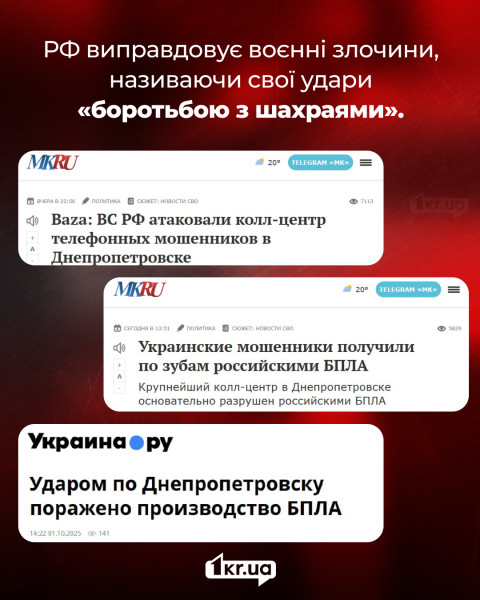 Любые попытки российской пропаганды объяснить свои действия «борьбой с мошенниками» или «уничтожением производства дронов» являются не более чем информационным прикрытием преступлений против человечности. Ведь даже если в здании работал колл-центр или компания, производящая технику, в многоэтажной застройке, нанести удар по такой цели дронами или ракетами означает сознательно подвергать опасности гражданских жителей.