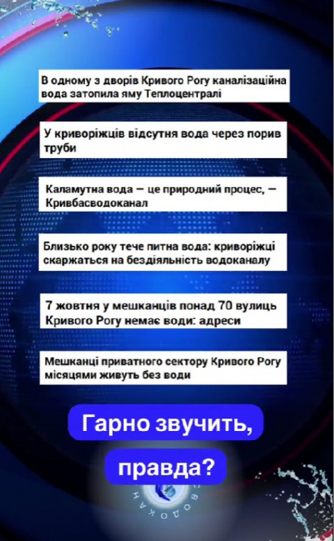 Однако все шесть заголовков, продемонстрированных в ролике, принадлежат редакции «Первого Криворожского». При этом два из них — журналисты сформулировали на основе официальных публикаций самого Кривбассводоканала: