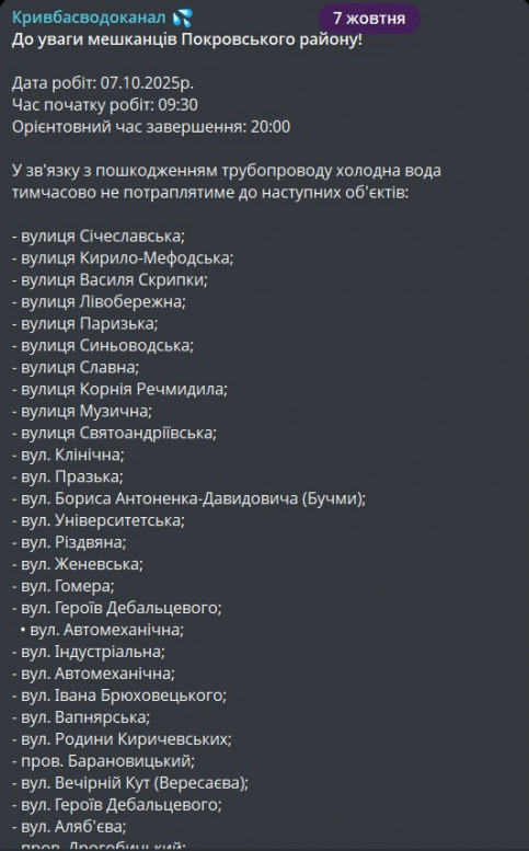 - «7 октября у жителей более 70 улиц Кривого Рога нет воды: адреса».