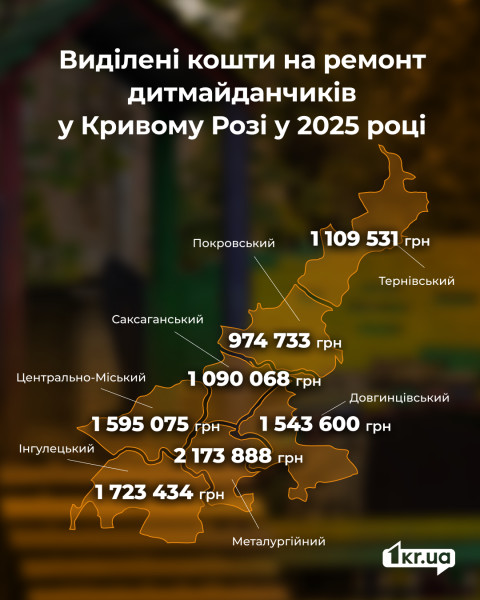 И.о. председателя райсовета Ингулецкий район Дмитрий Коростелев по запросу редакции «Первого Криворожского» относительно средств, выделенных на ремонт детских площадок сообщил сумму на ремонт спортивных и детских площадкахв - 2 576 000 гривен. По нашим подсчетами, именно на детские площадки выделили - 1,7 миллиона гривен, остальные - на спортивные. Исполнители Наталья Головня, Вита Суржко, Алексей Кондрашев.
