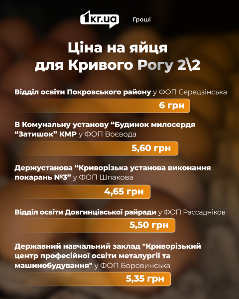 Криворожская гимназия "Интеллект" 17 октября заключила договор с предпринимателем Софией Боровинской про закупку 1970 яиц на сумму 10 933,50 грн. Выходит, что стоимость одного яйца - 5,55 грн (без налога).