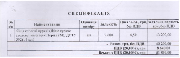 Криворожская городская больница №17 заключила 21 октября договор с ООО "Альянс фуд" на закупку 9 600 яиц на сумму 51 840 грн. Согласно документу, 1 яйцо стоило 4,5 грн (без НДС) и 5,40 грн (с НДС).