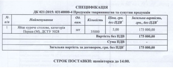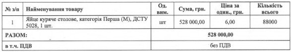 А месяц назад эта же предпринимательница продала 3100 яиц на 16430 гривен. Стоимость одного яйца по договору – 5,30 грн (без НДС).