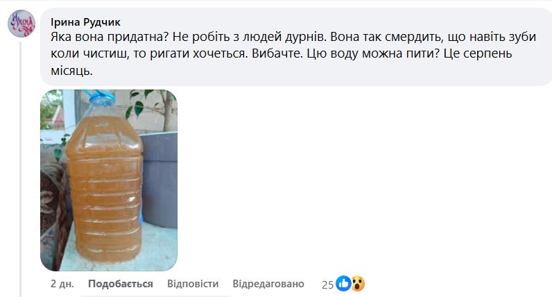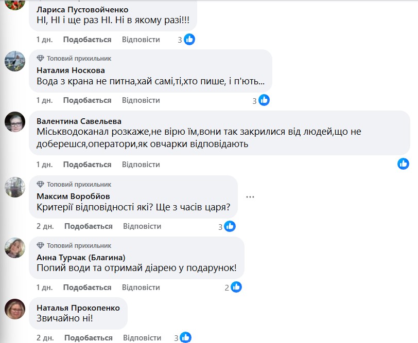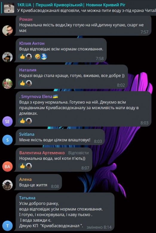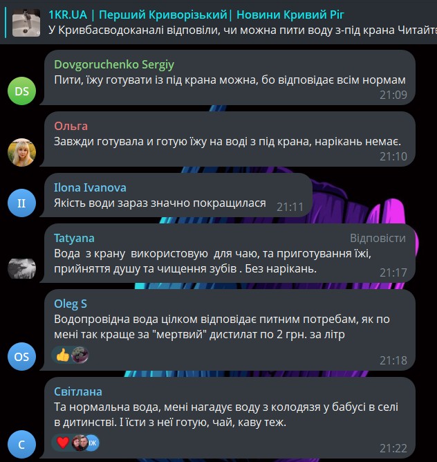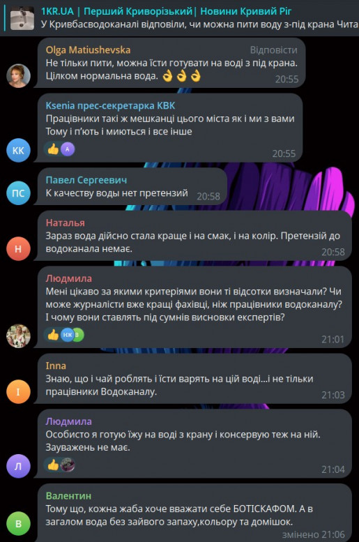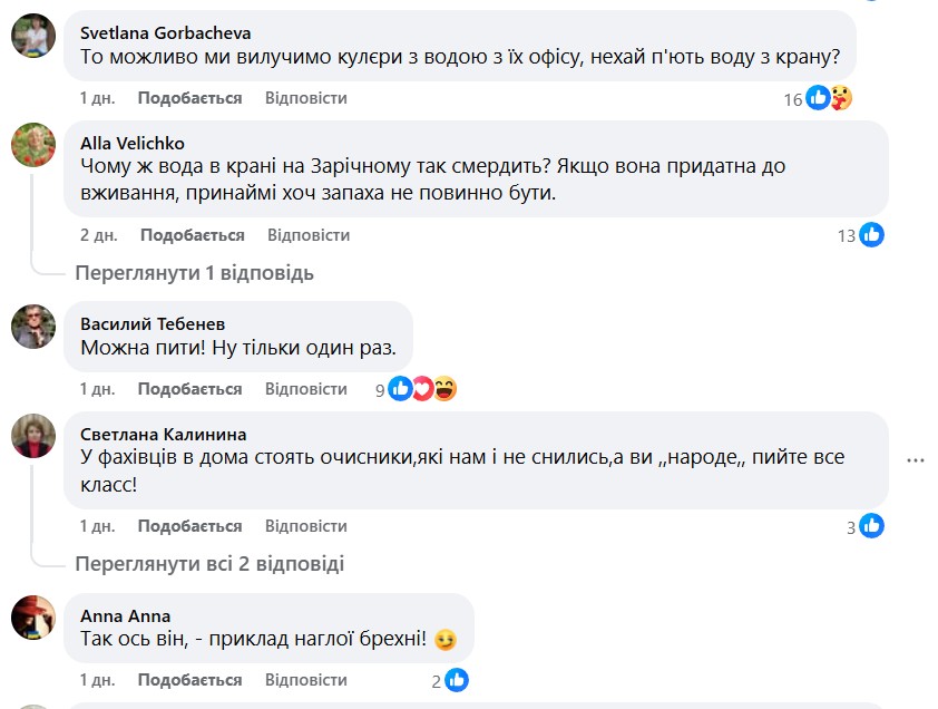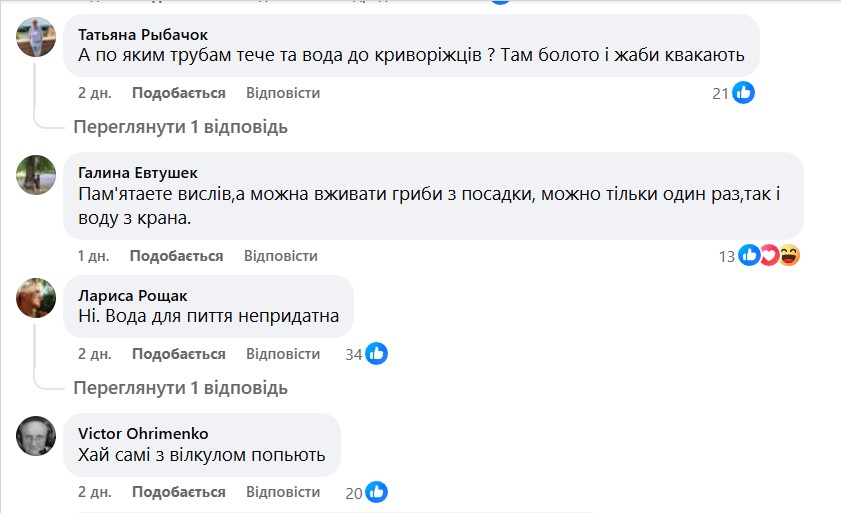 В то же время жители не согласны с этим заявлением. В комментариях на странице в Facebook к прошлой статье многие жители Кривого Рога оставили комментарии в соцсетях, в которых выразили сомнения по поводу качества воды. Люди добавляют фото из кранов, где вода выглядит мутной, и труб с ржавчиной внутри.