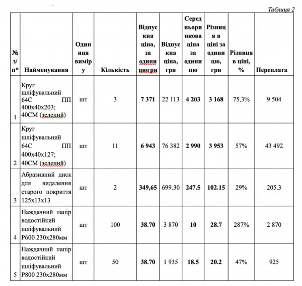 Абразивные материалы – шлифовальные круги, диски и наждачная бумага – закуплены с переплатой более 55 тысяч гривен.