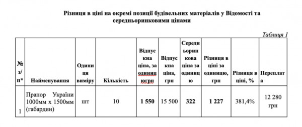 Так, предприятие закупило 10 флагов Украины из габардина за 15,5 тысячи гривен – по 1 550 гривен за штуку, тогда как в открытой продаже аналогичный флаг стоит около 320 гривен. Это могло привести к переплате более 12 тысяч гривен.