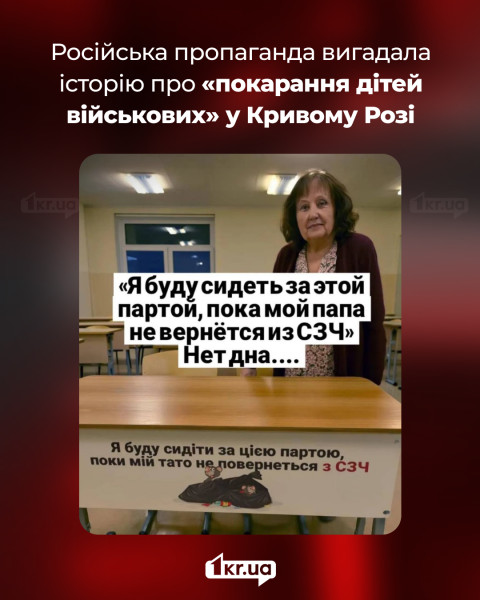 Пропагандистские сайты и социальные сети массово публикуют «фото из школы Кривого Рога», на котором изображена учительница у парты с надписью: «Я буду сидеть за этой партой, пока мой папа не вернется из СЗЧ».