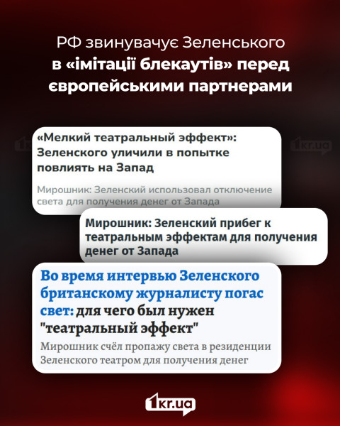 Враг также заявляет, что Зеленский не впервые использует «театральные постановки». Мол, он любит эффекты — как сирены для Байдена в Киеве или бомбоубежище для президента Германии в Чернигове. И теперь — «страдания от изуродованной энергосистемы».