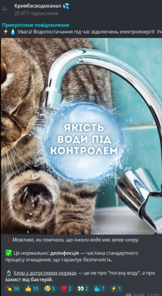 Впрочем, предприятие не уточняет, какие именно нормы хлора применяются в городе и какие показатели имеет вода в Кривом Роге.