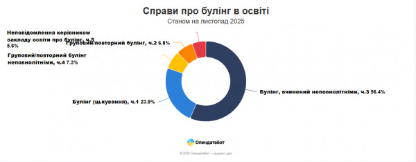 Более половины всех протоколов — 132 или 56% — составили за буллинг, совершенный малолетними или несовершеннолетними. Доля таких нарушений осталась неизменной по сравнению с прошлым годом, но почти вдвое больше, чем до начала полномасштабной войны.