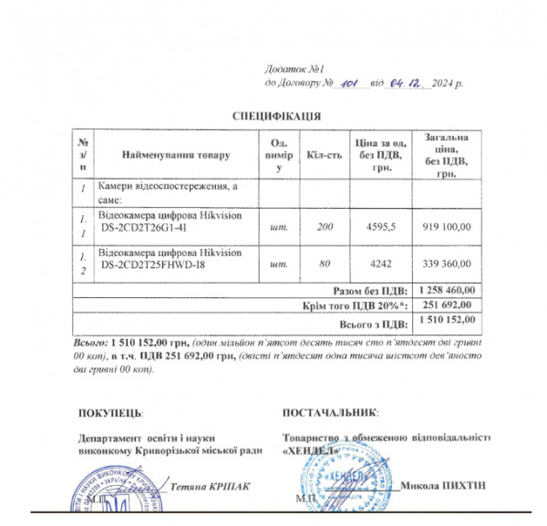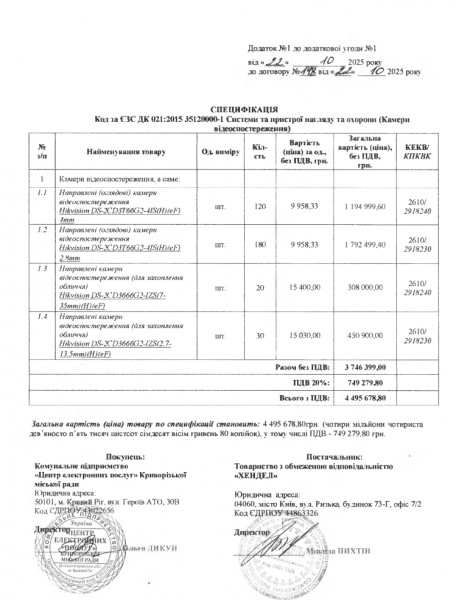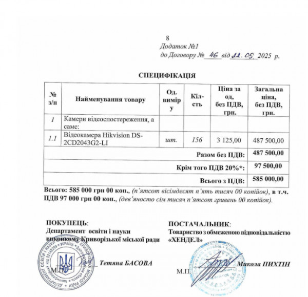 В мае 2025 года Департамент образования и науки Кривого Рога объявил открытые торги по приобретению 156 камер видеонаблюдения Hikvision DS-2CD2043G2-LI (или эквивалент) ожидаемой стоимостью 915 тысяч гривен. Победителем стала фирма "Хендел" с предложением в 585 тысяч гривен.