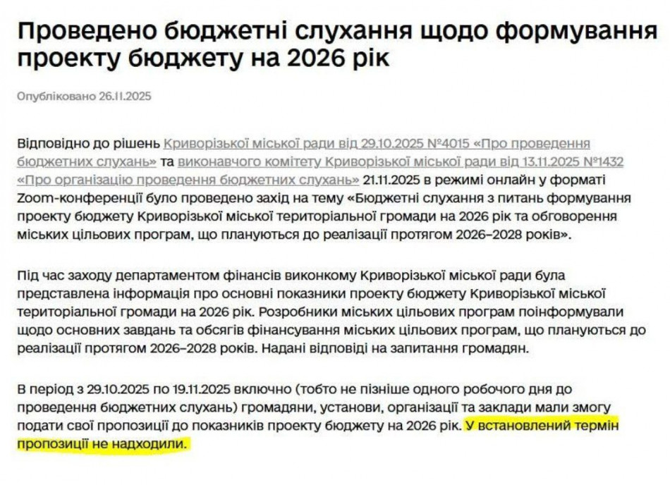 Криворожские чиновники заявили, что горожане не присылали предложений по проекту бюджета на 2026 год