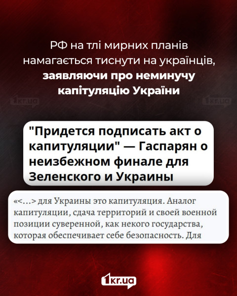 Очередное «пророческое» заявление распространил российский пропагандист Армен Гаспарян. Он утверждает, что Украину «заставят принять мирный план Соединенных Штатов Америки на условиях РФ» или «страна падет из-за очередных коррупционных скандалов», а Зеленский «все равно подпишет акт капитуляции».