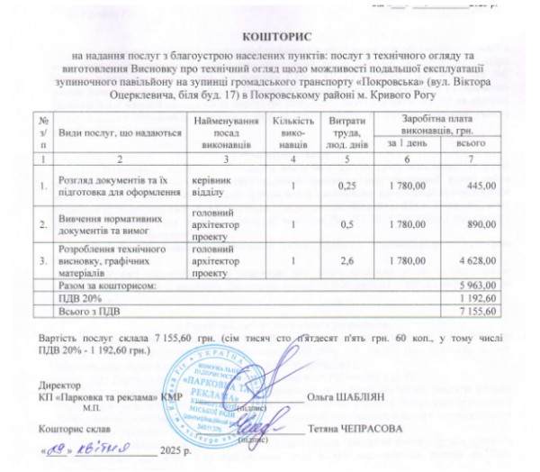 Кроме установки и ремонта остановочных павильонов, в Покровском районе выделяли средства из бюджета на технический осмотр остановок и их демонтаж.В апреле исполком заплатил КП «Парковка и реклама» 7 тысяч 155,60 грн за техническое освидетельствование павильона на остановке «Покровская» (ул. Виктора Оцерклевича, возле дома №17).
