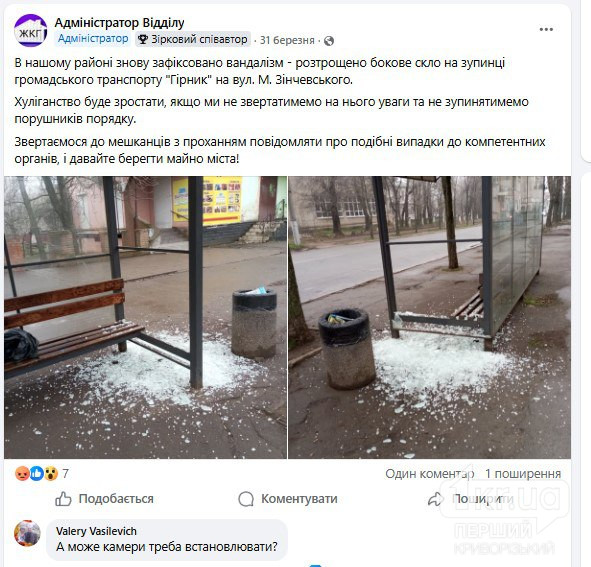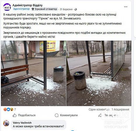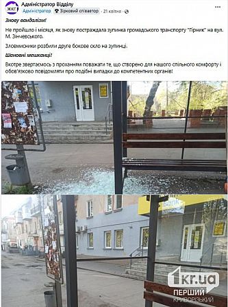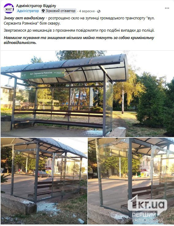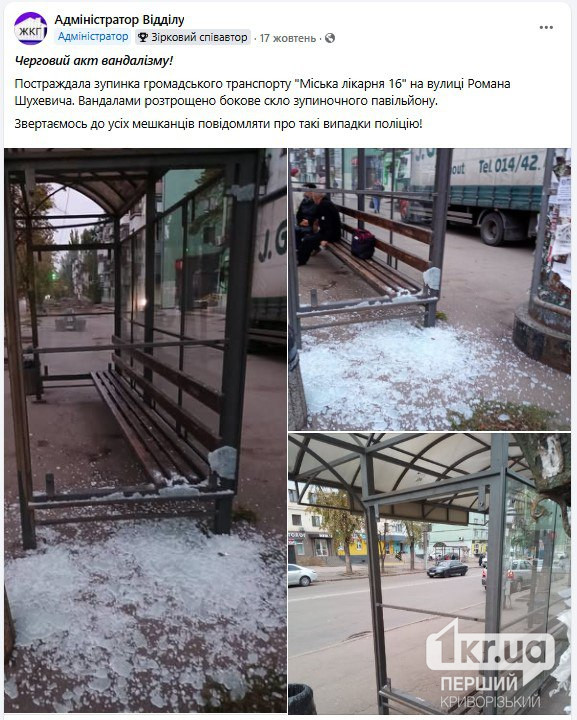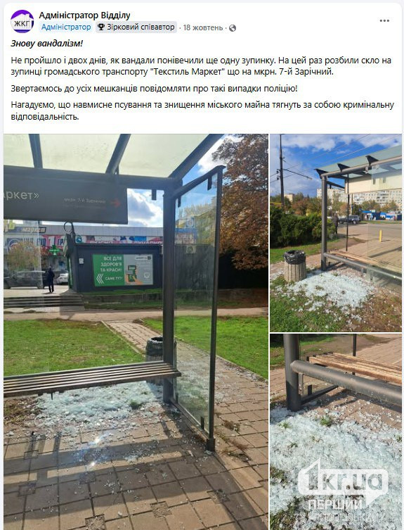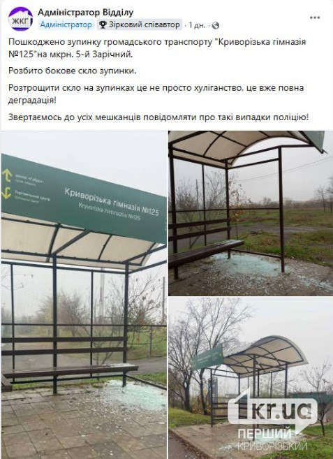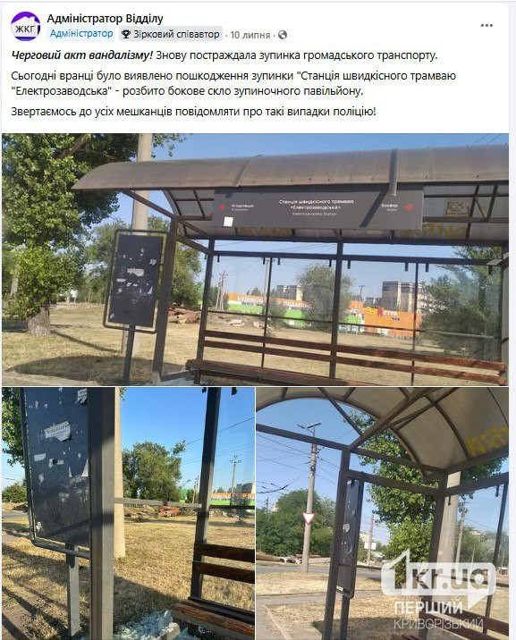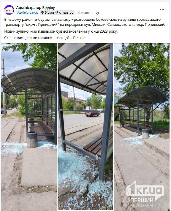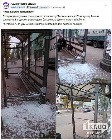 В 2025 году чиновники Покровского района неоднократно сообщали о случаях вандализма: разбиении стеклянных панелей на остановках «Горняк», «Горняцкий», «Электрозаводская», «Короля Даниила», «Криворожская гимназия №125» и т.д.«Разгромить стекло на остановках — это не просто хулиганство, это уже полная деградация», — считают в районном отделе ЖКХ.Местные жители, в свою очередь, в комментариях к сообщениям в соцсетях предполагают, что "так и задумано, будут деньги на ремонт выделят" и задают вопрос чиновникам: "Может, стоит камеры устанавливать?"