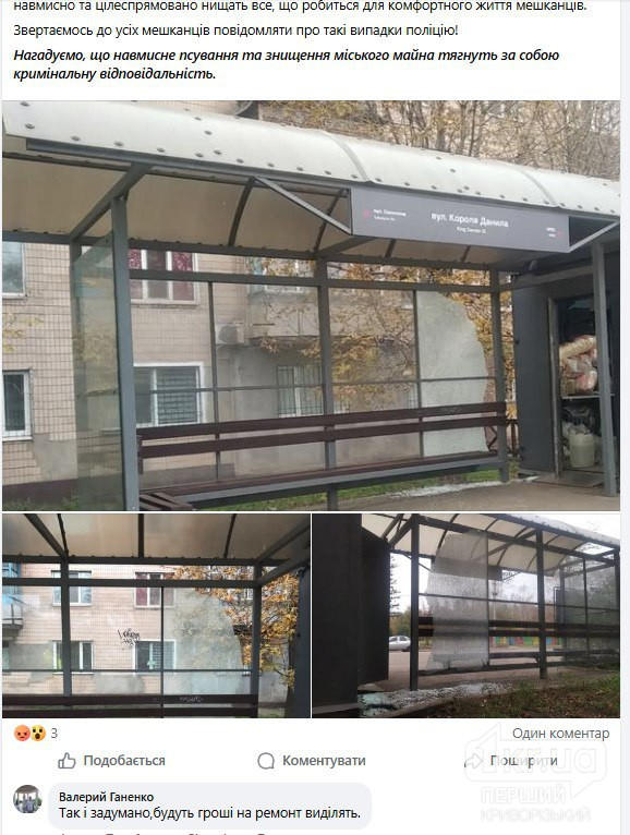 Во многих городах Украины и Европы прозрачные конструкции выбирают для того, чтобы остановка оставалась открытым, хорошо просматриваемым и освещенным пространством. Тогда есть шанс, что это место не превратится в место, где люди будут устраивать алкогольные посиделки, употреблять наркотики, происходят кражи, изнасилования и т.д. В условиях войны и постоянных актов вандализма считаю, что города должны учитывать не только рекомендации по Предотвращение преступлений посредством проектирования окружающей среды*, но и реальные риски ракетных и дроновых ударов, особенности менталитета населения и т.д. Возможно, стоит рассмотреть возможность инвестировать в более устойчивые материалы и продуманный дизайн, вместо того чтобы постоянно ремонтировать хрупкие стеклянные павильоны за средства общества»., — прокомментировала «Первому Криворожскому» гостевая научная сотрудница Института Восточного права Германии, в прошлом работница правоохранительных органов Кривого Рога, которая заботилась в том числе и о безопасности молодежи и коммуникациях с обществом, Юлия Цуркаленко.
