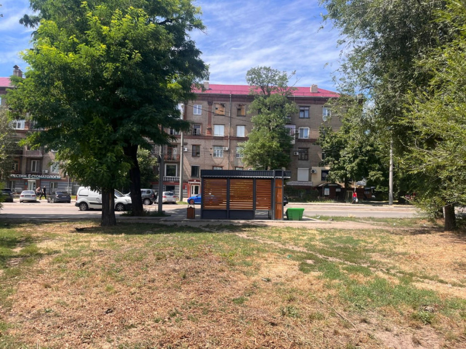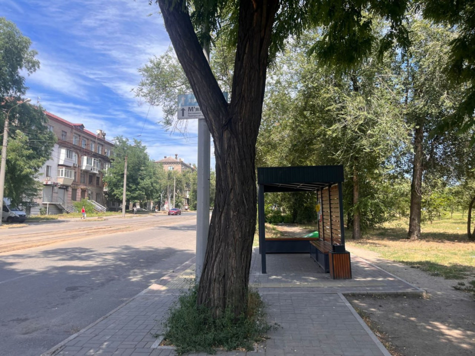 К примеру, в Харькове в августе 2022 года обустроили первую транспортную остановку, которая также служит укрытием во время обстрелов и воздушной тревоги. Сооружение рассчитано примерно на 30 человек. Остановка имеет прямую связь с диспетчером, бесплатный Wi-Fi и экран, на котором через камеры видеонаблюдения можно увидеть подъезжающий транспорт. Для тушения пожаров около 100 кг песка.А в Запорожье установили деревянные остановки. Фото предоставила редакции Анна Литовка (Запорожье, август 2025).