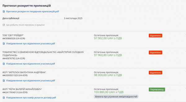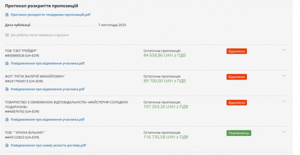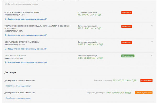 Отдел образования закупает 1593 подарка. Победило более дешевое предложение от ООО «Страна свободных» (более 253 тысяч гривен), но 20 ноября стало известно, что победитель не подписал договор. Таким образом, победил Виталий Хрептиевский с предложением более 262 тысяч гривен.Райисполком закупает 974 подарка. Победителем торгов объявили ООО «Мир трейдер», предложившее экономически наиболее выгодную цену — более 100 тысяч гривен.