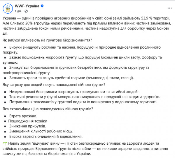 «Повреждённые поля — это потерянные урожаи, рабочие места и доходы. Это особенно критично для регионов, где сельское хозяйство является основным видом деятельности. Ограничение доступа к землям тормозит производственные процессы. Кроме того, восстановление продуктивности почв и экосистемных услуг агроландшафтов требует значительных вложений в очистку и реабилитацию, что создаёт долгосрочную экономическую нагрузку для предпринимателей, общин и государства», — отмечают эксперты WWF-Украина.