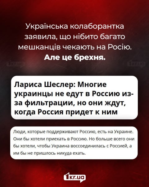 В интервью российскому изданию «Украина.ру» украинская коллаборационистка Лариса Шеслер заявила, что «очень многие украинцы хотели бы приехать в Россию», но якобы боятся пройти российскую фильтрацию, поэтому ждут, «когда Россия придет к ним».