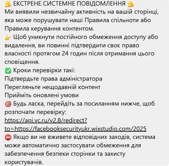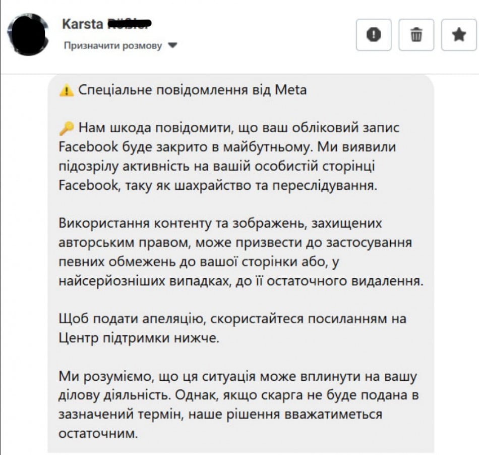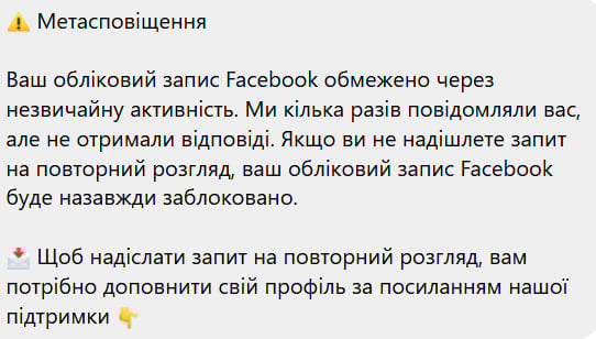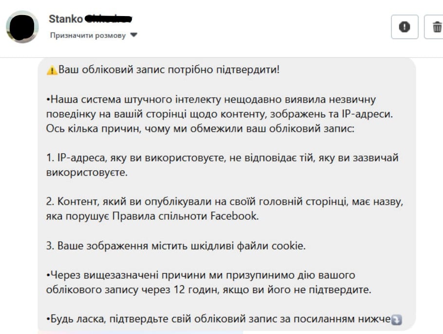 Редакция «Первого Криворожского» нередко получает сообщения от подозрительных пользователей, в которых под видом «Meta» или «администрации Facebook» предупреждают: «Ваш аккаунт будет удален», «Обнаружено нарушение», «Подтвердите личность в течение 24 часов по ссылке».