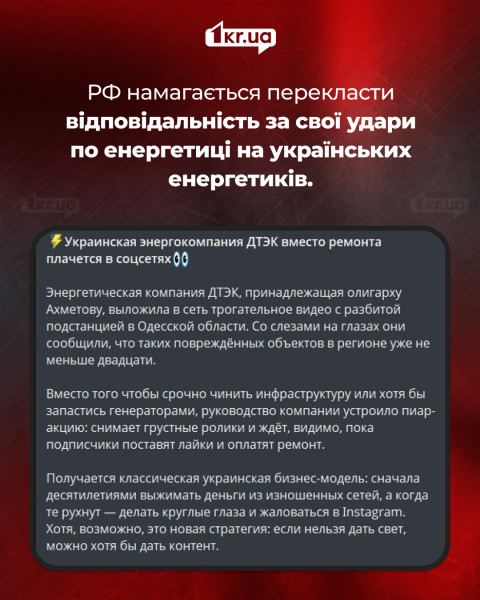 Российские ресурсы высмеивают видео украинских энергетиков, в которых показывают разрушенные подстанции после обстрелов. В постах утверждают, что компания занимается «пиаром», «собирает лайки» и вместо ремонта поврежденных объектов якобы снимает эмоциональные ролики. Пропаганда подает это как «типичную украинскую модель бизнеса»: мол, инфраструктуру десятилетиями не ремонтировали и выжимали из нее деньги, а когда она разрушилась — начали просто жаловаться в социальных сетях.
