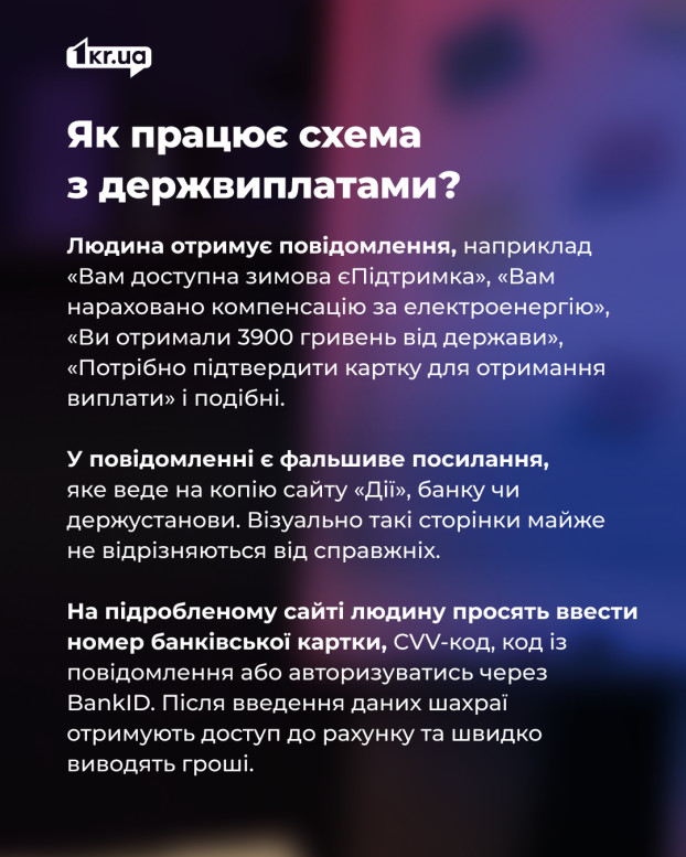 По словам правоохранителя, механизм мошенничества почти всегда один и тот же.Человеку приходит сообщение с текстом наподобие «Вам доступна зимняя поддержка», «Вам начислена компенсация за электроэнергию», «Вы получили 3900 гривен от государства», «Нужно подтвердить карту для получения выплаты» и подобным.