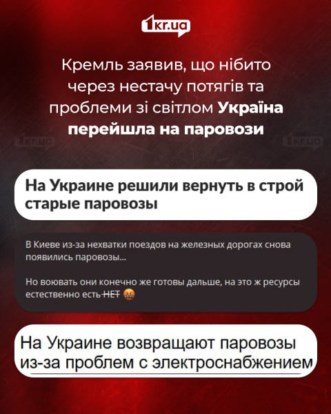 На фоне обстрелов железнодорожной инфраструктуры Украины российские сайты и пророссийские телеграмм-каналы распространяют сообщения о том, что «Укрзалізниця» вынуждена возвращаться к паровозам из-за «нехватки современных поездов» и проблем с электроснабжением.