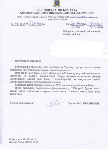Как отметили в администрации Амур-Нижнеднепровского района, памятник коммунарам в Днепре не является объектом культурного наследия и находится на балансе райадминистрации как коммунальное имущество городской территориальной общины.