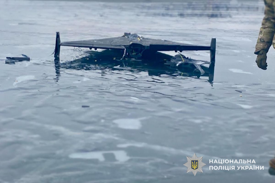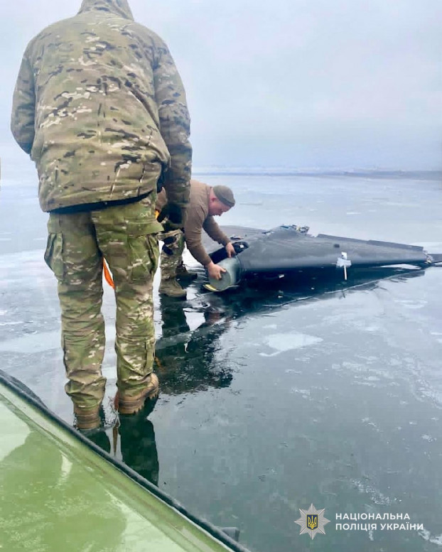 На замерзшей поверхности реки Днепр в Днепропетровской области полицейские обнаружили вражеский ударный беспилотник с боевой частью и отдельную боевую часть от шахеда.