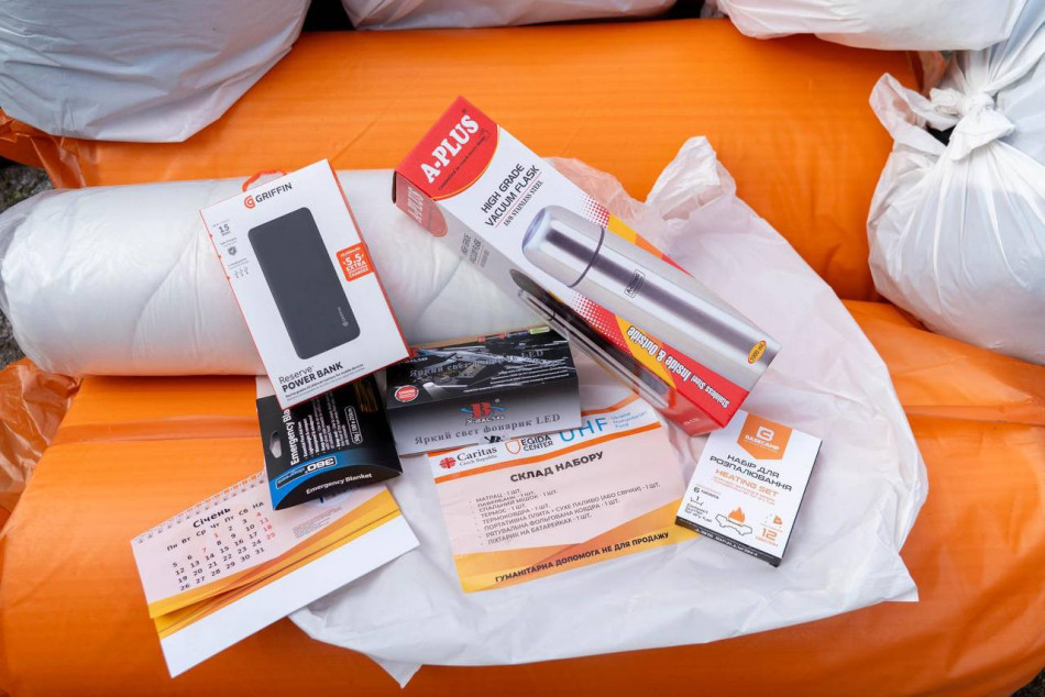 В наборы входят спальные мешки, термоодеяла, павербанки, термосы, фонарики, переносные плиты с горелками и другие вещи первой необходимости.