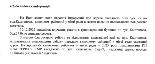 Позже в ответ на обращение редакции «Первого Криворожского» исполком сообщил, что саженцы деревьев передали инициативные жители района.