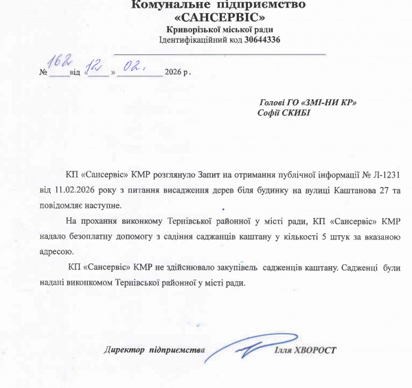 В ответе на запрос редакции предприятие отметило, что саженцы были предоставлены исполкомом Терновского районного в городе совета, а сотрудники «Сансервиса» высадили их бесплатно.