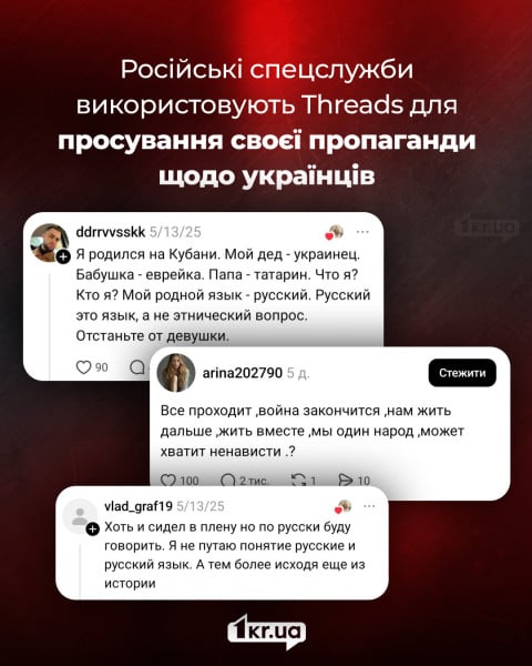 Threads официально заблокирована в РФ, однако российские пользователи обходят ограничения с помощью VPN. Редакция «Первого Криворожского» заметила, что присутствие пророссийских нарративов в соцсети имеет признаки системной и скоординированной деятельности, что может быть частью информационно-психологических операций (ИПСО) российских спецслужб.