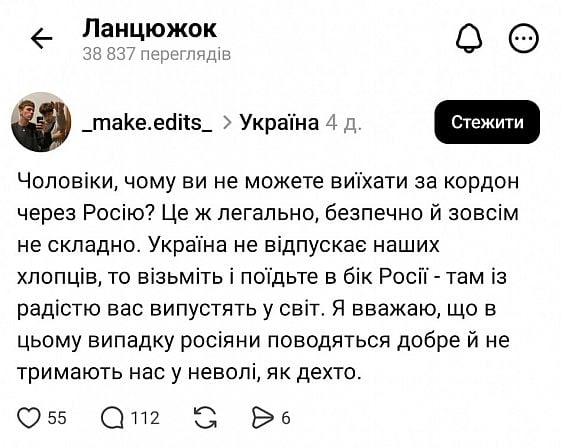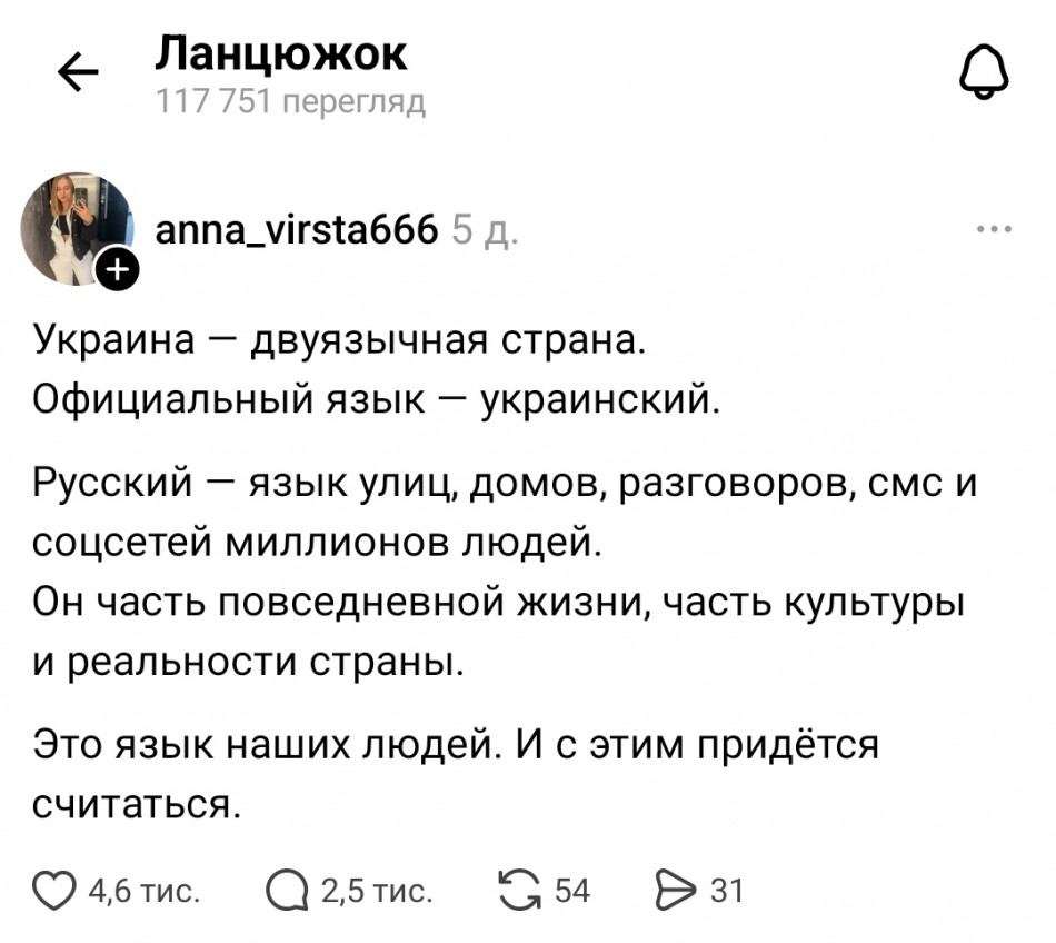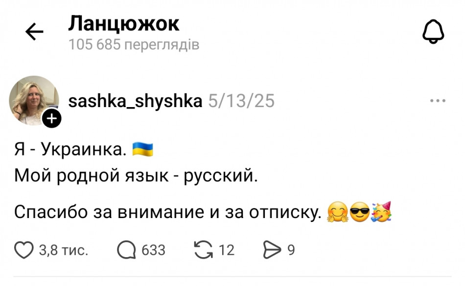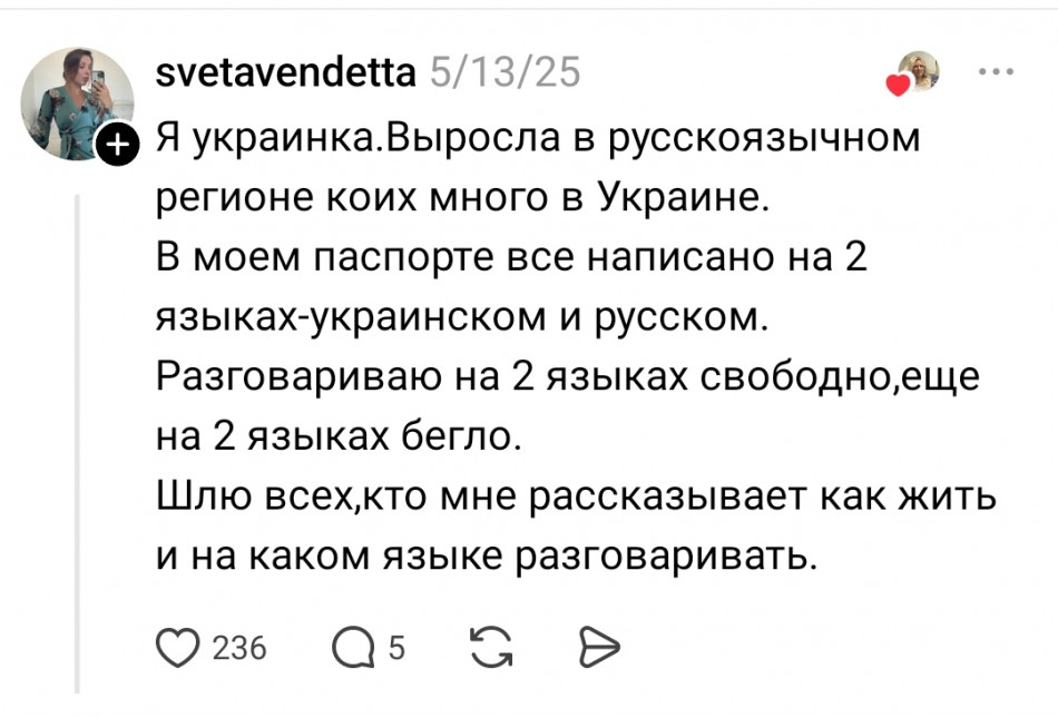 Такие посты подаются как «личные истории», но их цель — углубление внутреннего раскола. Они навязывают мысль, что главная проблема в Украине — языковой вопрос, а не российская агрессия.