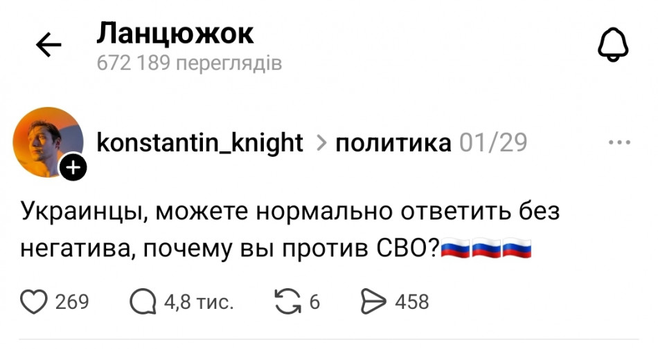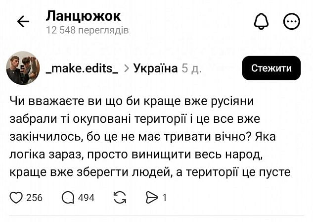 Информационная война продолжается ежедневно — не только на фронте, но и в лентах соцсетей. Threads, как и любая другая платформа, может становиться инструментом для манипуляций, когда анонимные или псевдоукраинские аккаунты продвигают месседжи, размывающие ответственность России и сеющие сомнения внутри общества.