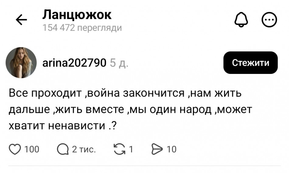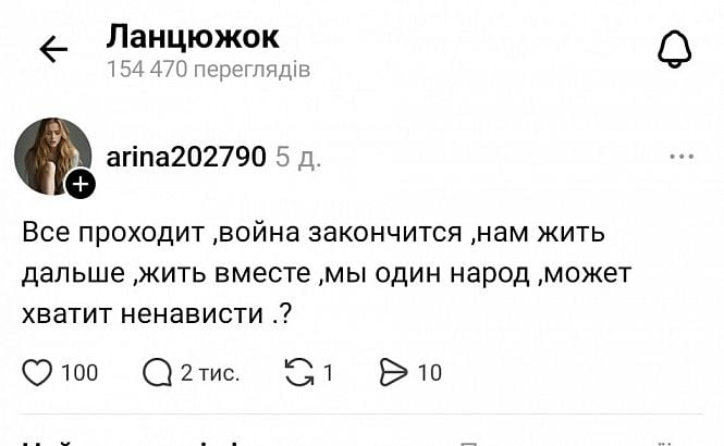 Часто встречаются посты типа: «Всё проходит, война закончится, нам жить дальше, жить вместе, мы один народ, может, хватит ненависти».