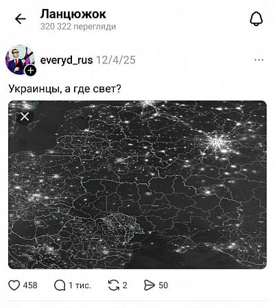 - «Украинцы, а где свет?» — с прикреплённым фото Украины и соседних стран ночью из космоса, где Украина выглядит тёмной.