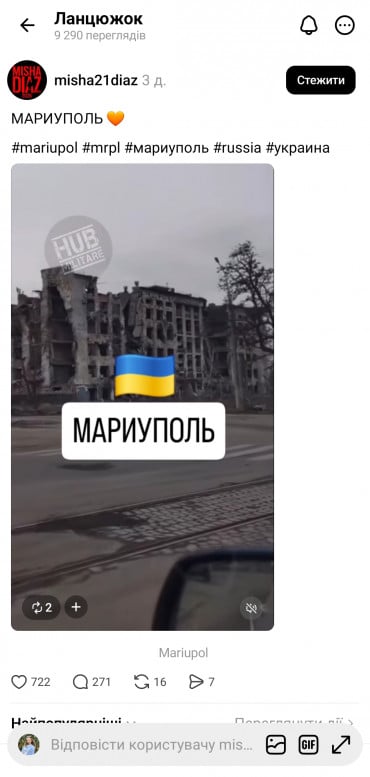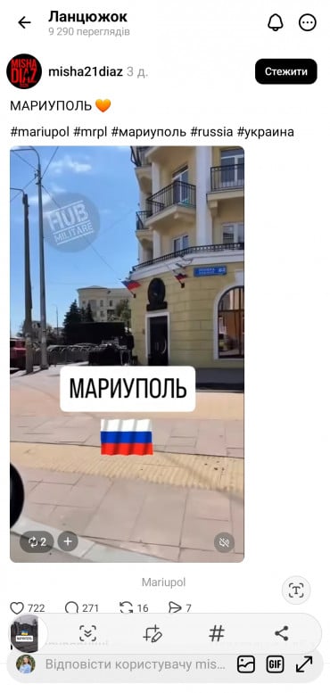 Отдельное направление — аккаунты, которые регулярно публикуют контент о «освобождённых» территориях, например о Мариуполе. Там продвигается тезис, что «при Украине город был в руинах, а пришла РФ — и город расцвёл».