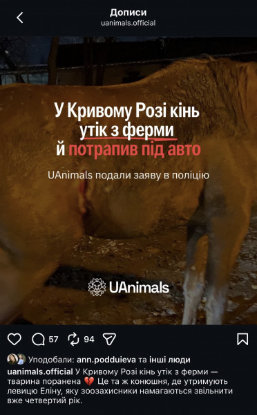 Ожидаем дальнейших новостей о местонахождении и состоянии лошади», — пишут на официальной странице UAnimals в одной из соцсетей.