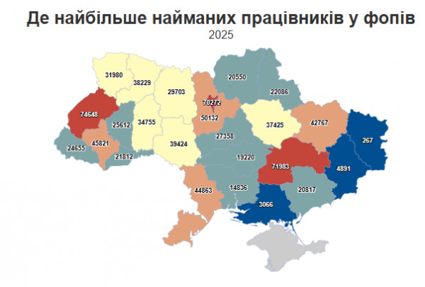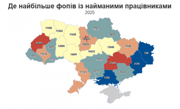 Больше всего ФЛП с работниками зарегистрировано на Днепропетровщине — 27 491. Почти догоняет Львовщина — 27 275 предпринимателей. Третье место занимает Киев – с 25 782 ФЛП.