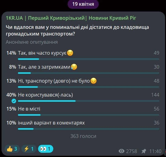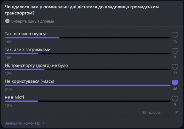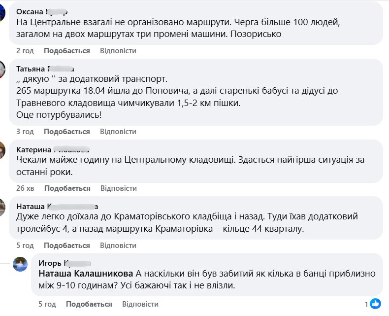 «"Спасибо" за дополнительный транспорт. Маршрутка №265 18.04 шла до Поповича, а дальше старенькие бабушки и дедушки до Травневого кладбища шли пешком 1,5-2 км. Вот так "позаботились"!», — прокомментировала пользовательница Фейсбук Татьяна.