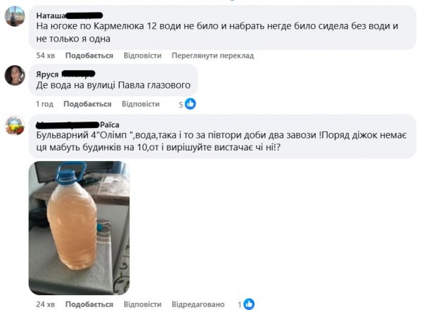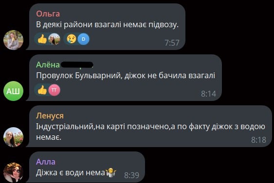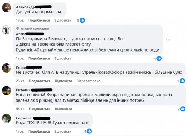 «Площадь Владимира Великого — одна бочка прямо на площади. Ещё одна — на Тесленко возле маркета. Домов как минимум 40 — невозможно обеспечить таким количеством воды», — пишет Анна.